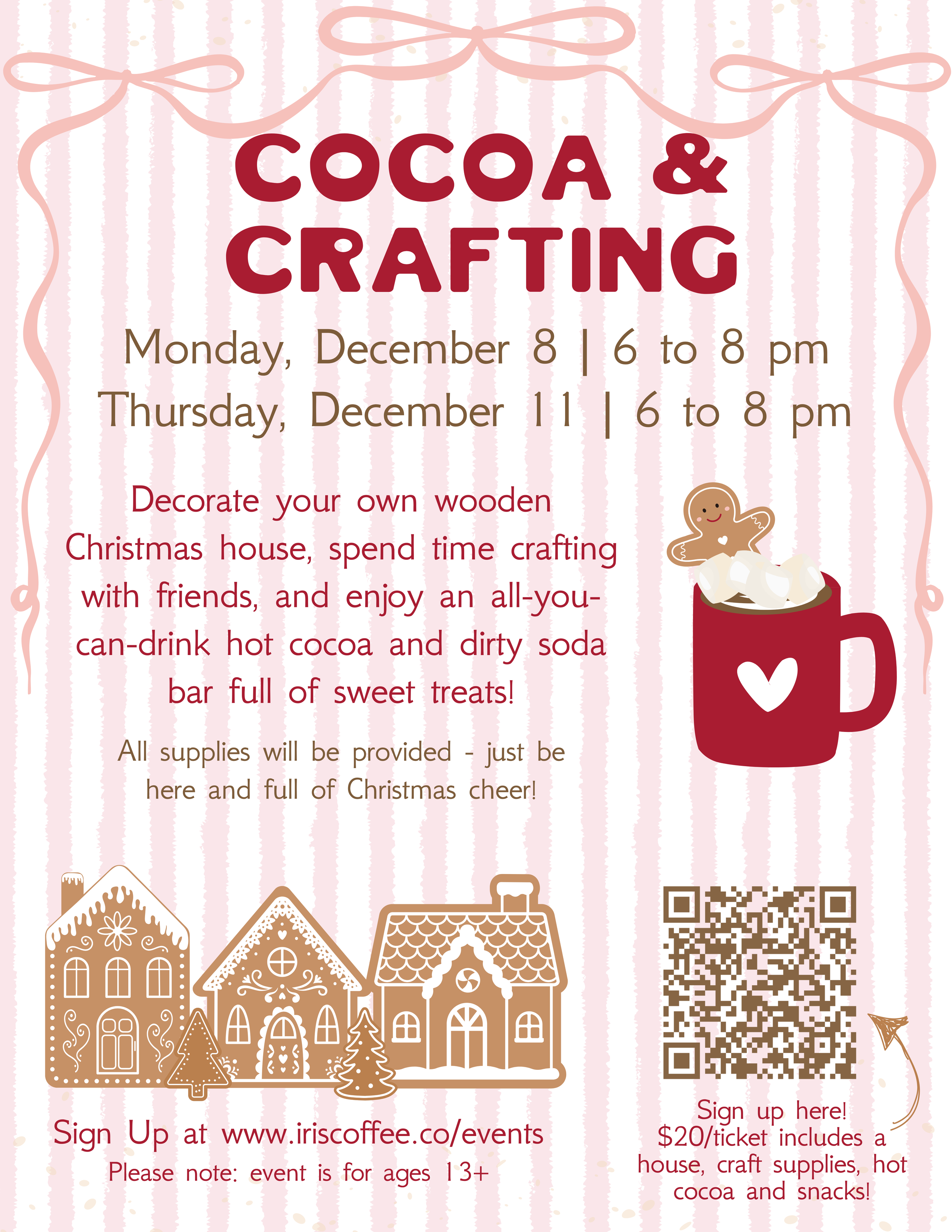 We know you’ll work up an appetite from all that crafting, so we’ll also have bottomless hot cocoa AND a little festive dirty soda bar for you to try. Some sweet and savory snacks will also be available.