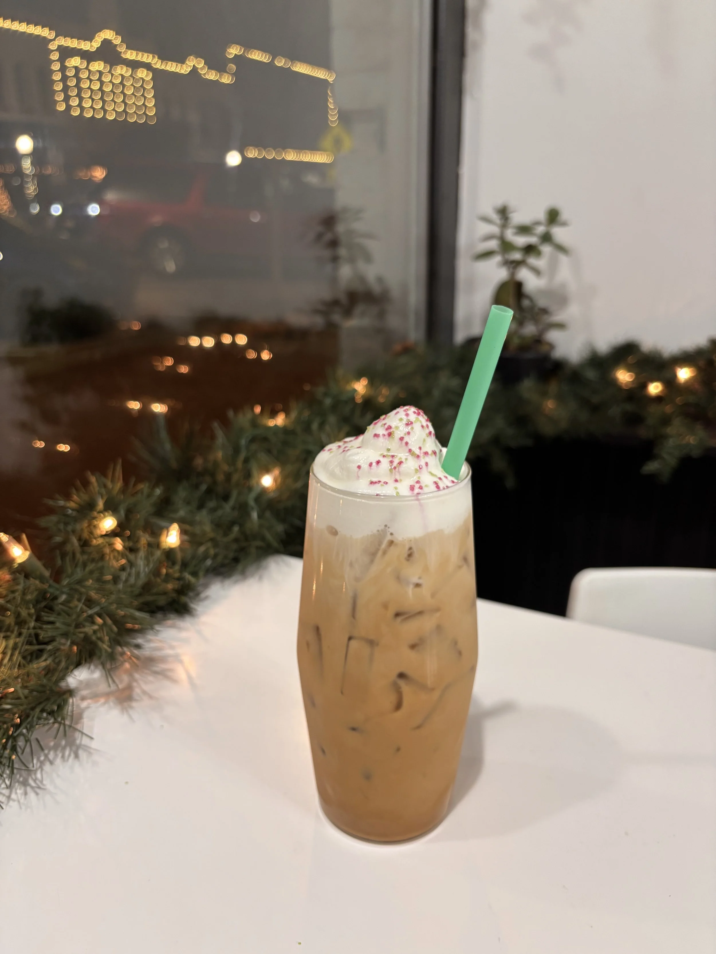 Housemade Almond Sugar Cookie Syrup, Espresso, Milk, Vanilla โFrostingโ Cold Foam, Red & Green Sprinkles (dye-free)